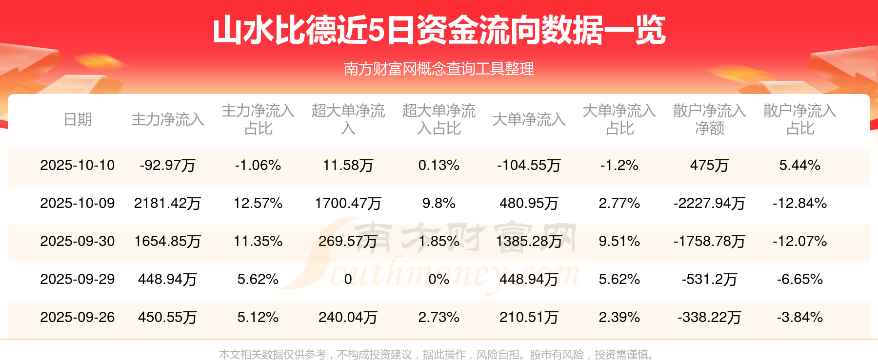 10月10日消息,山水比德主力资金净流出92.97万元,超大单资金净流入11.58万元,散户资金净流入475万元。