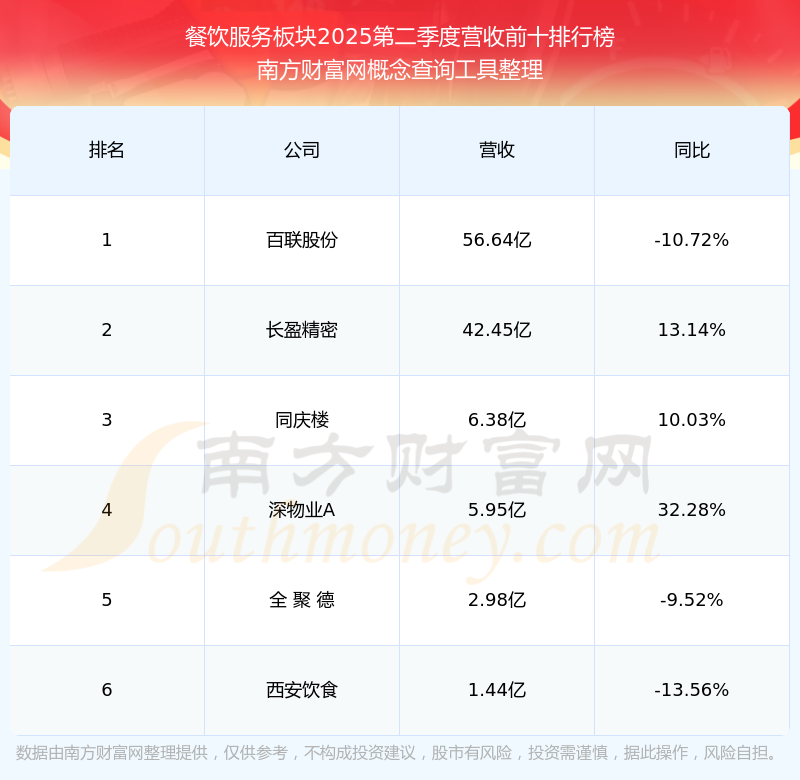 按照概念查询工具统计,该股所属板块为餐饮服务板块,该板块共有6只股票,同庆楼2025第二季度营收在该板块中排名为第3名,该板块2025第二季度营收排名前十的股票如下表: