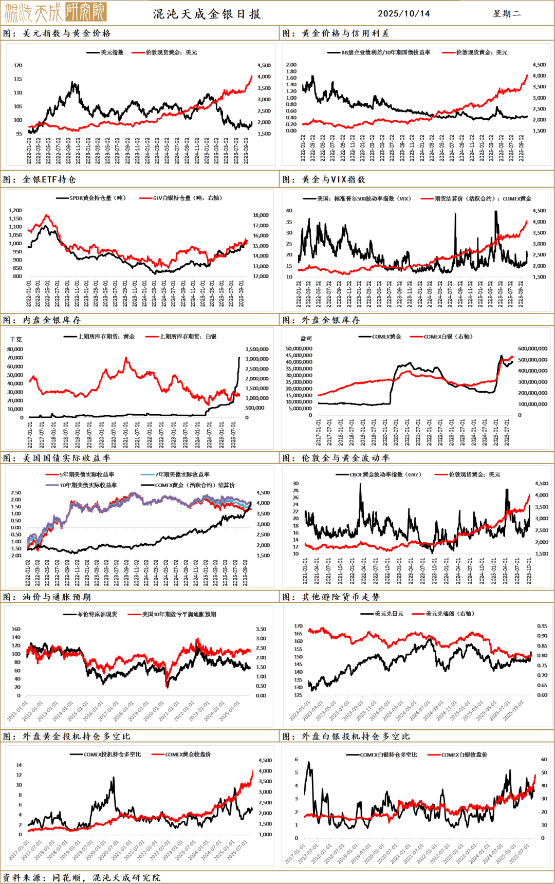 美国国会参议院先后否决了由共和党和民主党各自提出的旨在短暂维持联邦政府运转的短期拨款提案,这也意味着政府将面临关门的情形,同时一定程度增加市场风险,而至今政府关门尚未解决,这对经济风险正在加大;美国债务规模9月再次上升至37.637万亿,较比上月上升接近4000亿,平均付息利率为3.363%,较比上月稍有放缓,但仍处于高位。财政债务逻辑上从中长期而言驱动黄金,但仍取决于经济走势为主。