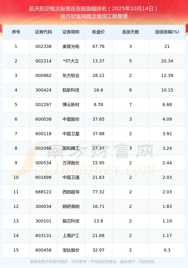 2025年10月14日航天航空概念股票连涨股涨幅排名