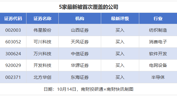 首次覆盖方面,10月14日券商共给出了5次首次覆盖,其中伟星股份)