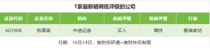 评级调低方面,10月14日,券商调低1家上市公司评级,中信证券对牧高笛)