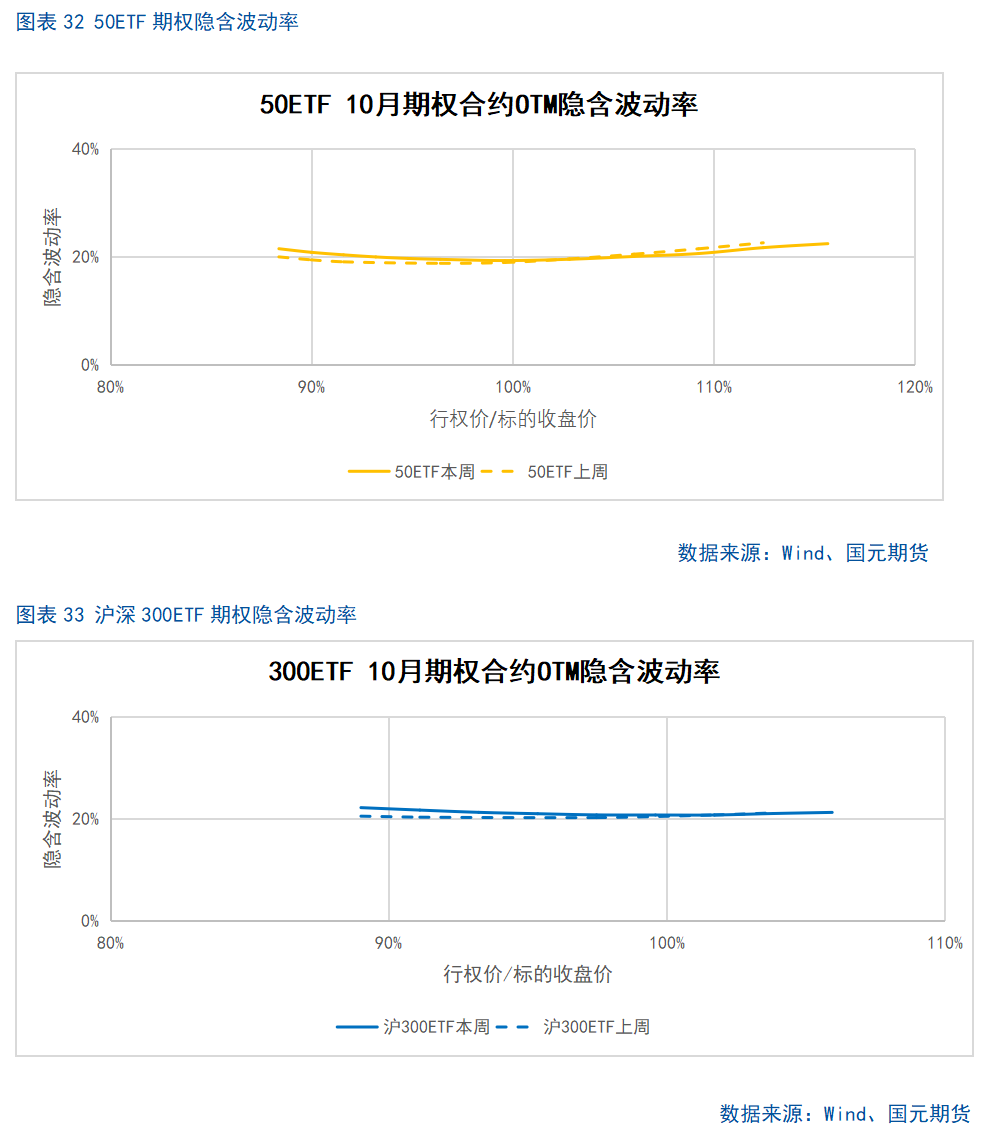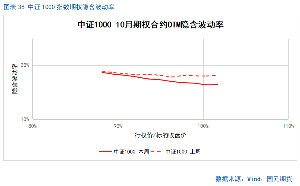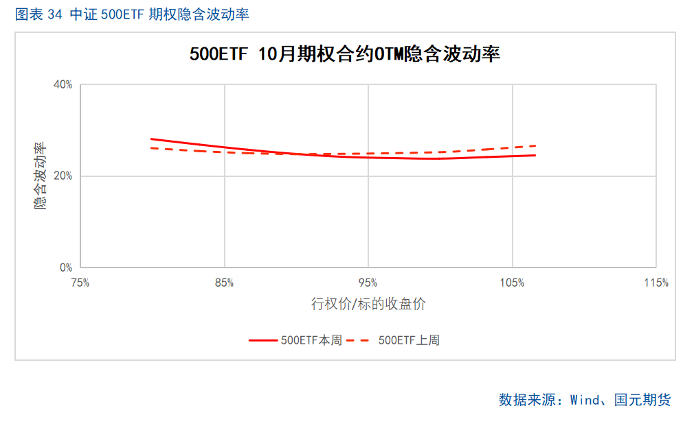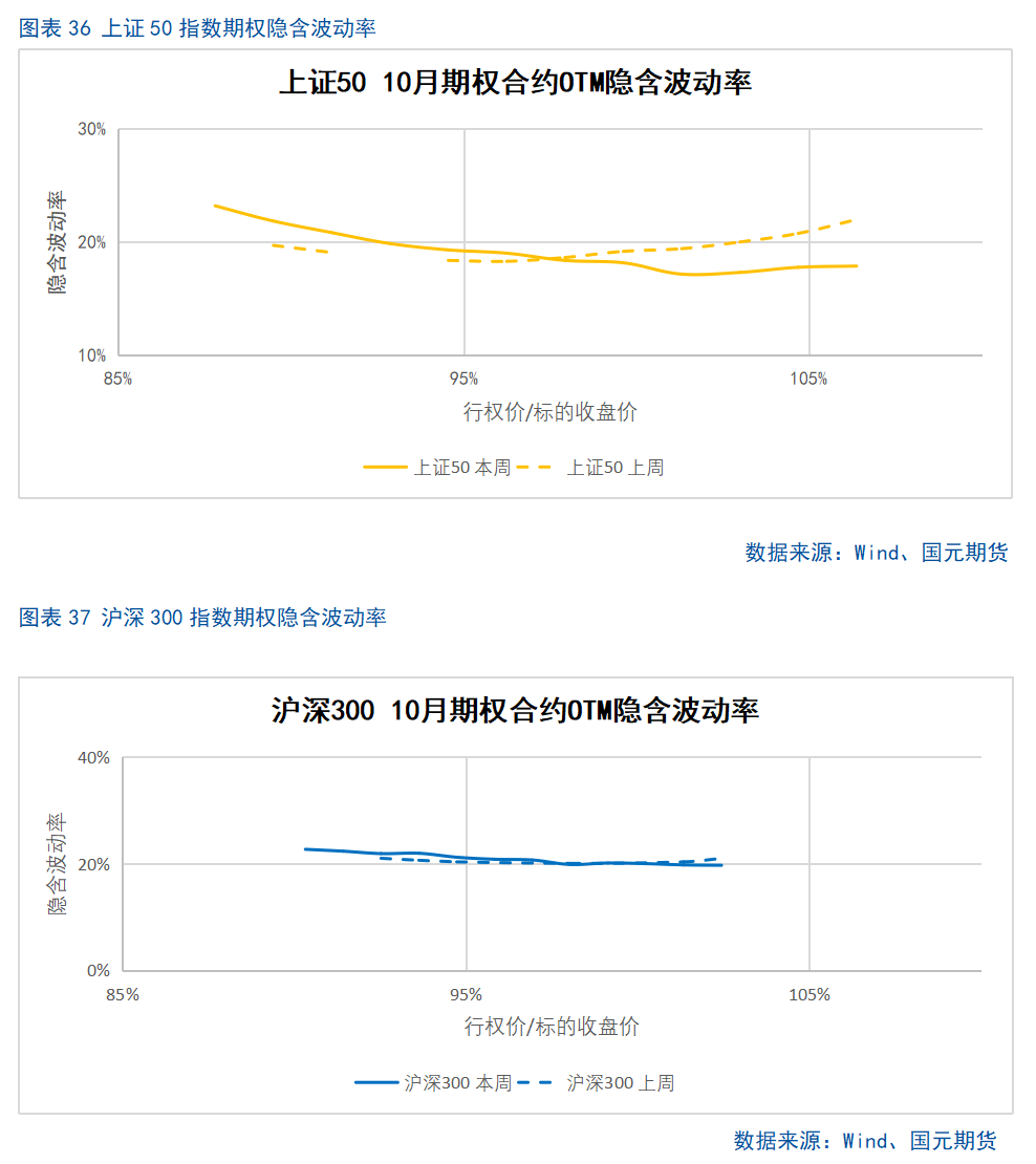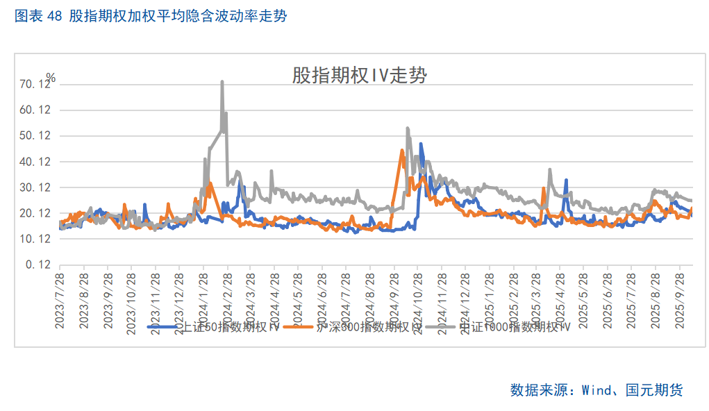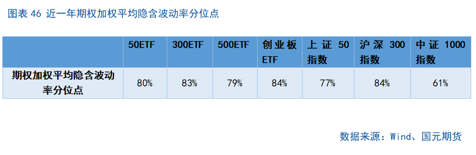 股指震荡整理,期权加权平均隐含波动率整体维持在较高水平。当前各标的期权加权平均隐含波动率在19%-34%附近,整体处在近年较高水平。现货指数近两个月波动较大,市场对于股指大幅波动预期较高。