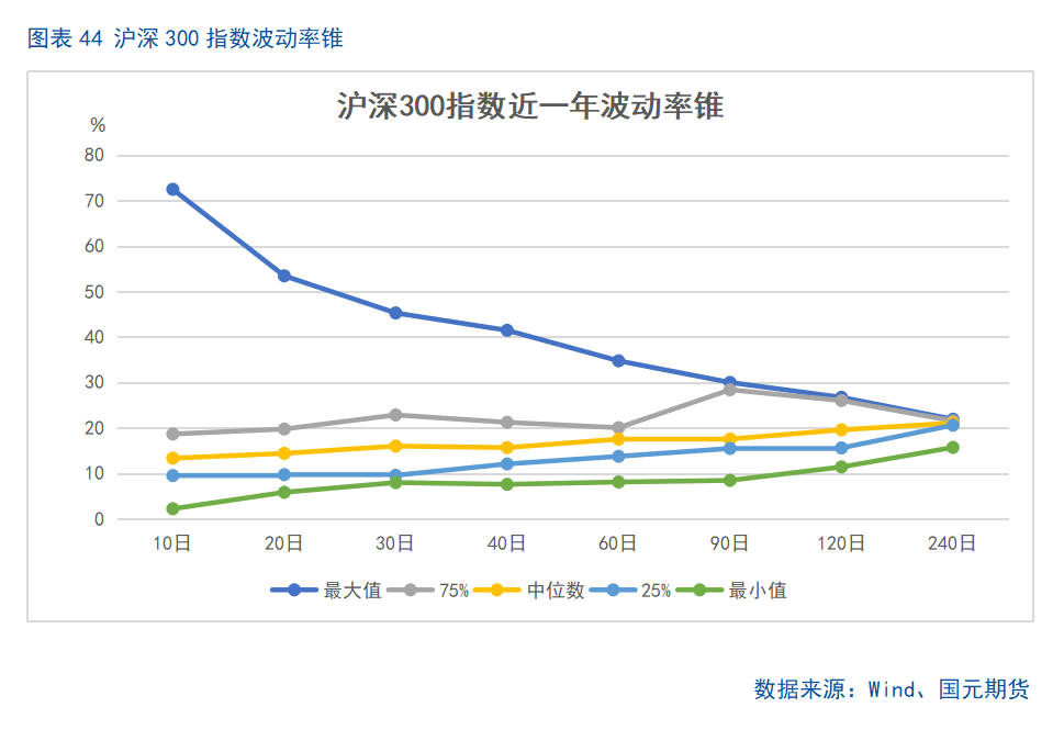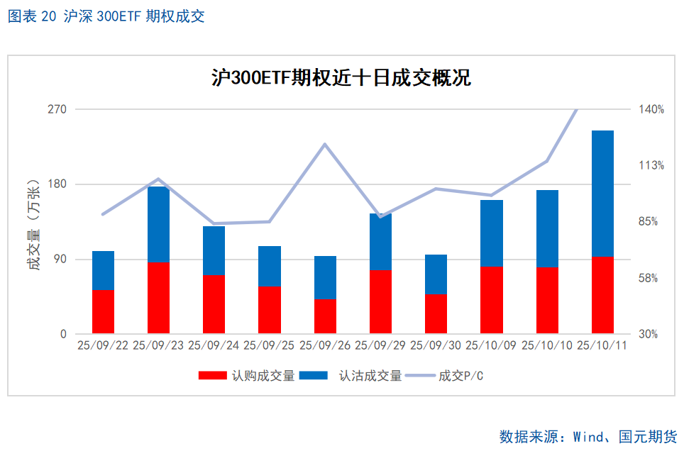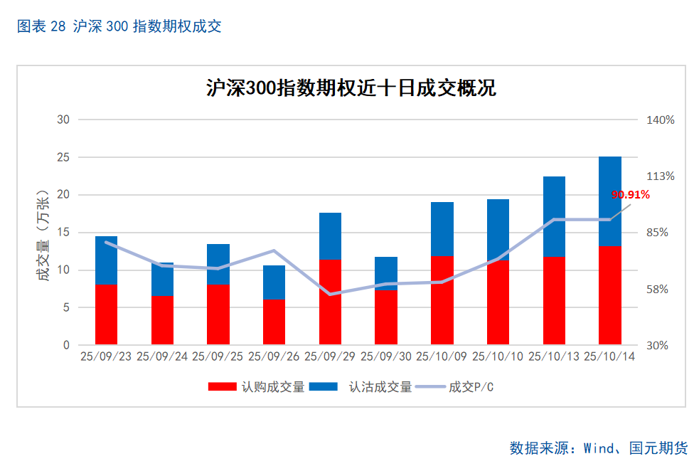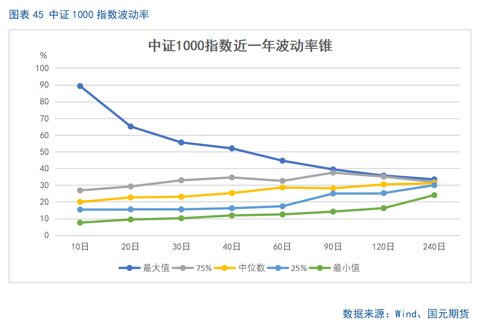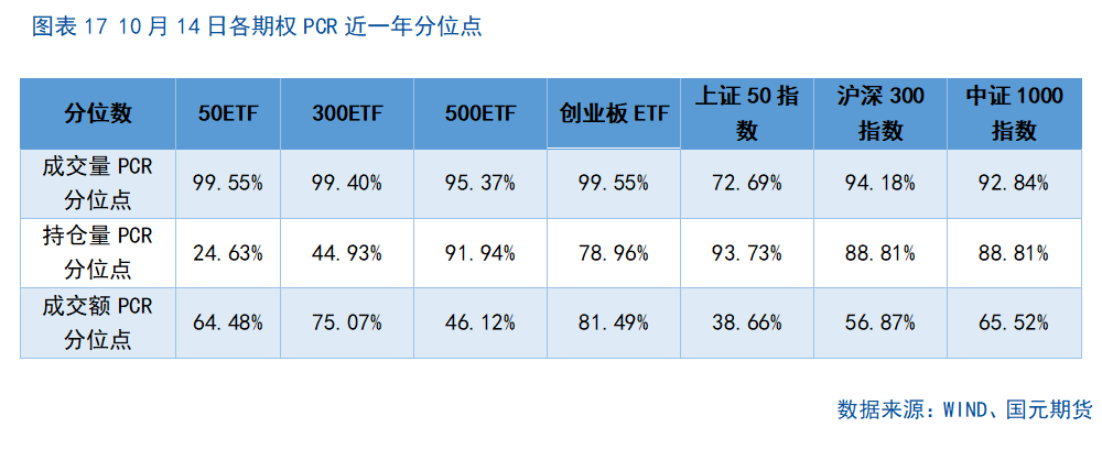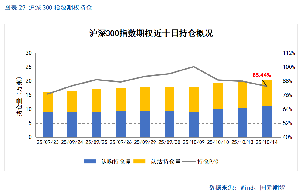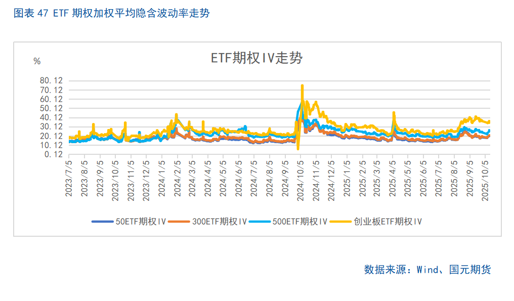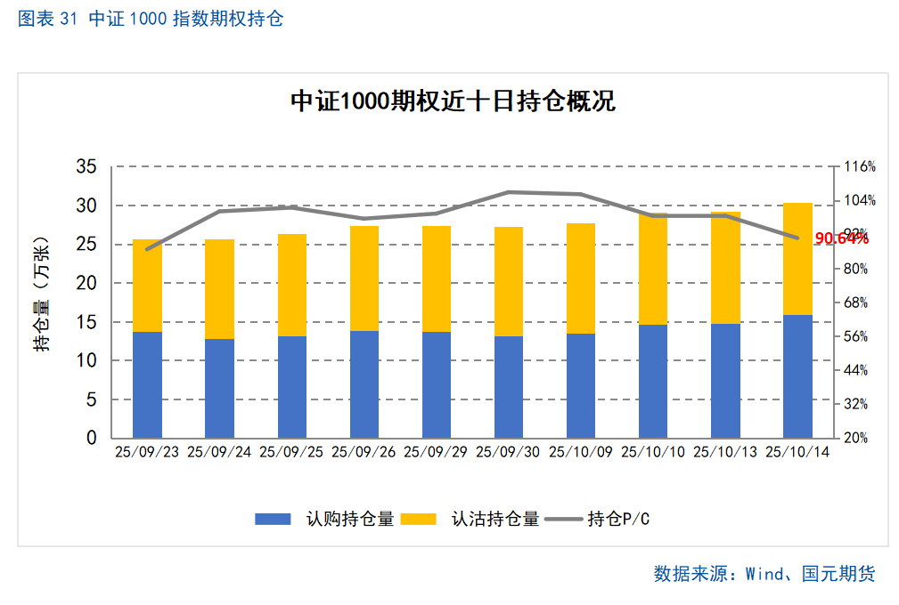 股指震荡整理,期权加权平均隐含波动率整体维持在较高水平。当前各标的期权加权平均隐含波动率在19%-34%附近,整体处在近年较高水平。现货指数近两个月波动较大,市场对于股指大幅波动预期较高。