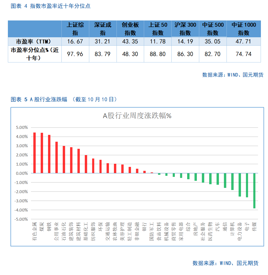 上周主要股指多数回调,上证指数上涨0.37%,深证成指下跌1.26%,创业板指大跌3.86%;两市日均成交额超2.5万亿元,成交额依旧处在历史极高水平。有色、煤炭以及钢铁板块涨超4%。传媒、电子以及电力设备板块出现较大回调。