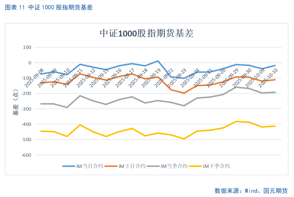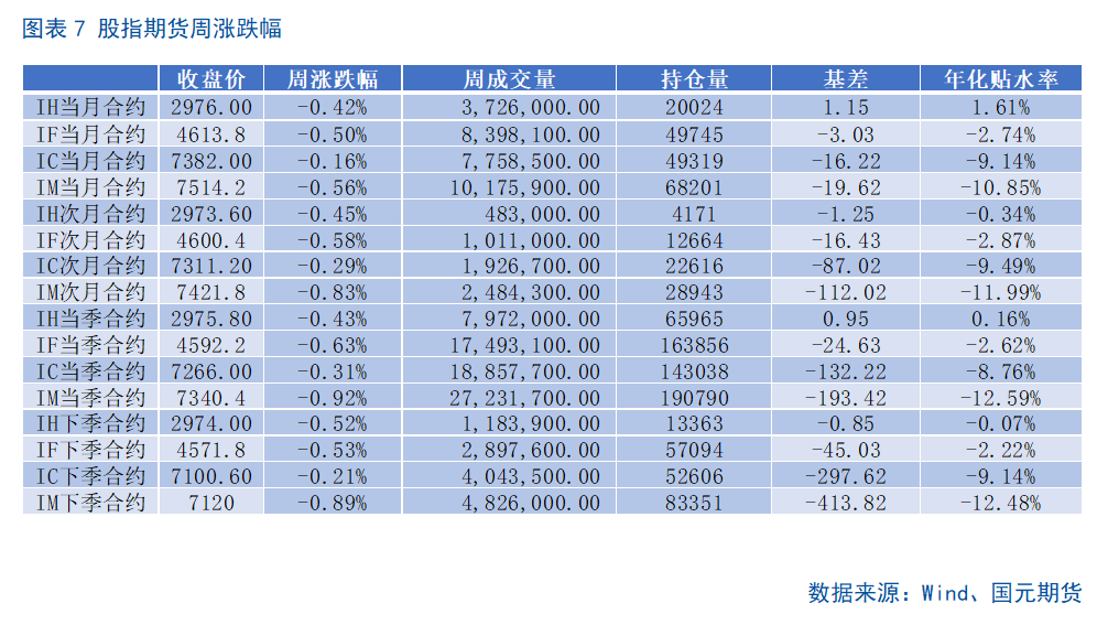 上周股指期货合约多数小幅走低,IM跌幅相对较大,中小盘出现一定回调。近期IM以及IC贴水有所收窄,目前市场对于指数持续走低预期不强。