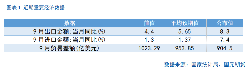 9月外贸超预期回升:出口同比8.3%,显著高于前值4.4%与一致预期5.65%;进口同比7.4%,高于前值1.3%与预期1.37%。受进口修复与大宗价格走高影响,贸易顺差降至904.5亿美元(前值1023.29亿美元)。总体上,“外需边际改善+内需回补+价升因素”共同抬升当月进出口增速。