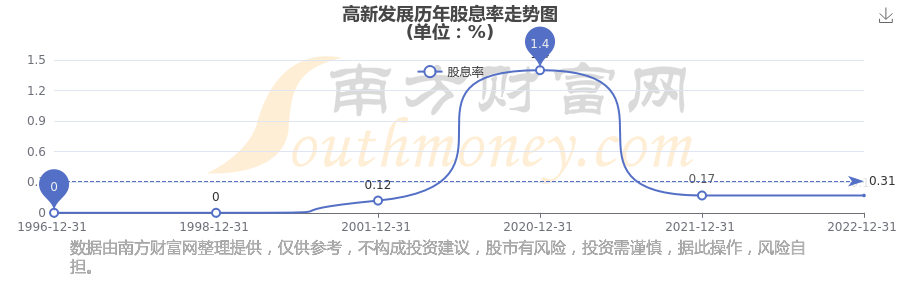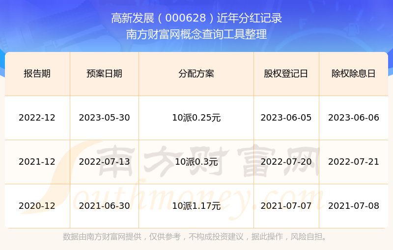 高新发展最新一次公布的分红方案为10派0.25元。本次权益分派股权登记日为2023年6月5日,除权除息日为2023年6月6日,派息日为2023年6月6日。
