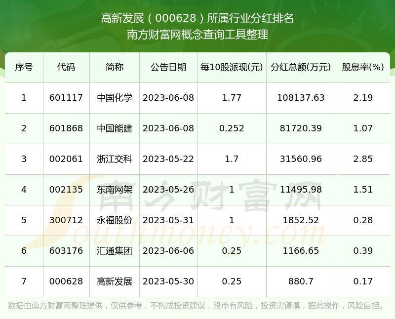 按照趋势选股系统统计,高新发展所属行业为工程建设行业,工程建设行业分红排名情况如下表:
