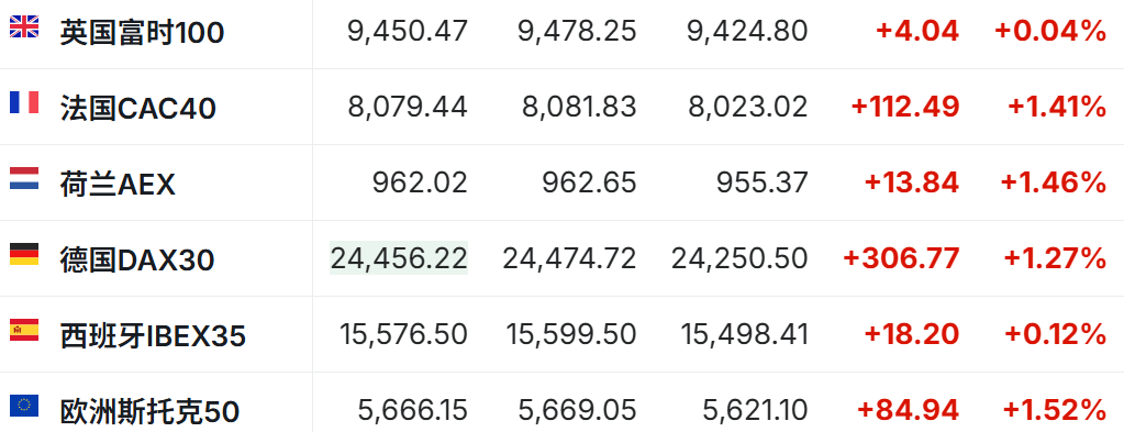 2.截至发稿,德国DAX指数涨1.27%,英国富时100指数涨0.04%,法国CAC40指数涨1.41%,欧洲斯托克50指数涨0.1.52%。