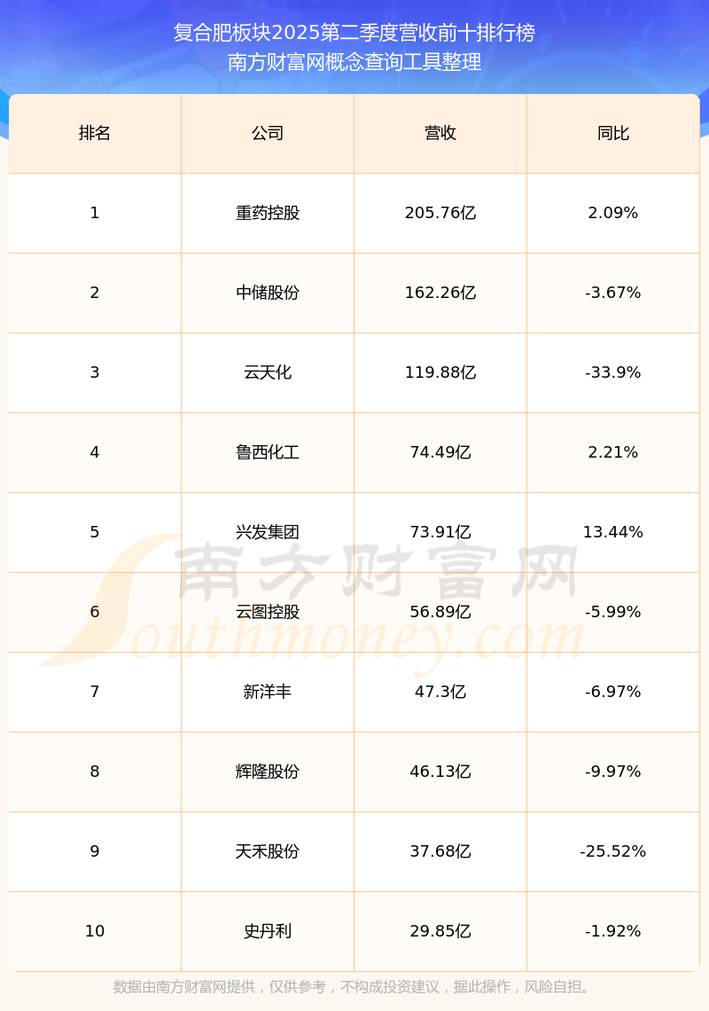 按照概念查询工具统计,该股所属板块为复合肥板块,该板块共有44只股票,红四方2025第二季度营收在该板块中排名为第28名,该板块2025第二季度营收排名前十的股票如下表:
