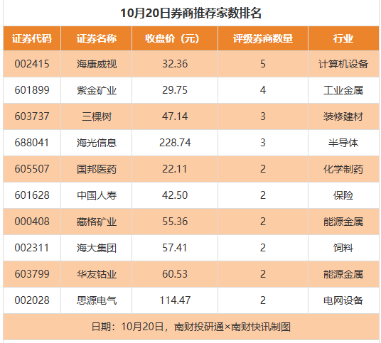 从券商推荐家数来看,10月20日有32家上市公司得到券商推荐,其中海康威视获得5家推荐,紫金矿业获得4家推荐,三棵树)
