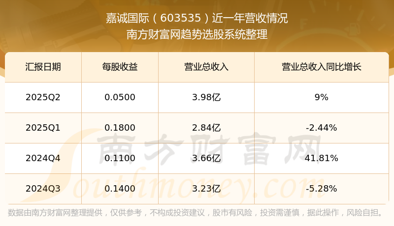 嘉诚国际披露了2025年第二季度财报。报告显示,嘉诚国际2025年第二季度实现营收3.98亿元,同比9%;归母净利润5577.26万元,同比6.21%。