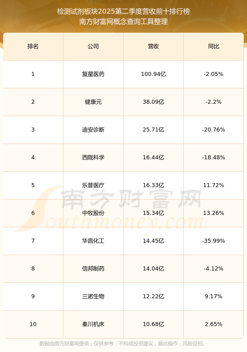 按照概念查询工具统计,该股所属板块为检测试剂板块,该板块共有46只股票,中源协和2025第二季度营收在该板块中排名为第23名,该板块2025第二季度营收排名前十的股票如下表: