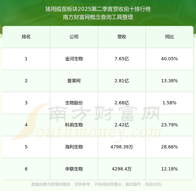 按照概念查询工具统计,该股所属板块为猪用疫苗板块,该板块共有6只股票,普莱柯2025第二季度营收在该板块中排名为第2名,该板块2025第二季度营收排名前十的股票如下表: