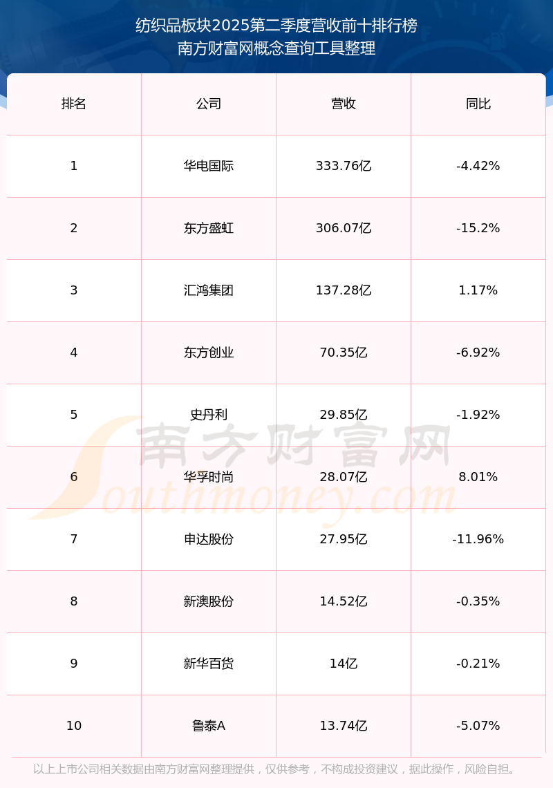 按照概念查询工具统计,该股所属板块为纺织品板块,该板块共有32只股票,众望布艺2025第二季度营收在该板块中排名为第32名,该板块2025第二季度营收排名前十的股票如下表: