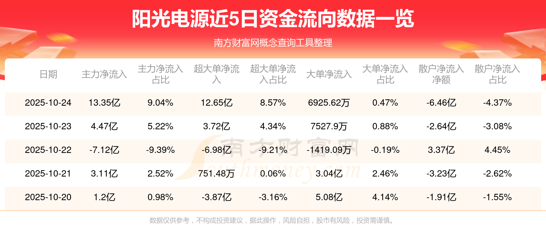 10月24日消息,阳光电源主力资金净流入13.35亿元,超大单资金净流入12.65亿元,散户资金净流出6.46亿元。