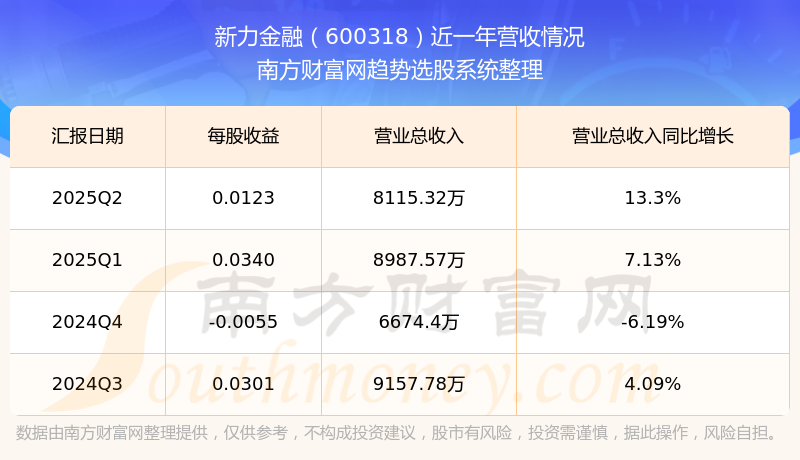 新力金融2025年第二季度显示,公司主营收入8115.32万元,同比13.3%;归母净利润630.81万元,同比33.2%;扣非净利润630.9万元,同比58.17%。