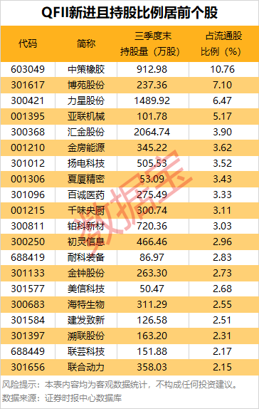 从持股看,已公布三季报公司中,360余家公司前十大流通股东名单出现QFII身影,超130股为三季度新进,其中,中策橡胶(603049)、博苑股份(301617)等20股QFII持股比例超2%。