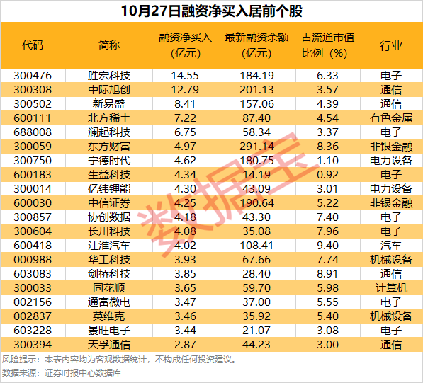 具体到个股,10月27日获融资净买入1亿元以上的有67只,其中19只融资净买入额超3亿元。胜宏科技)