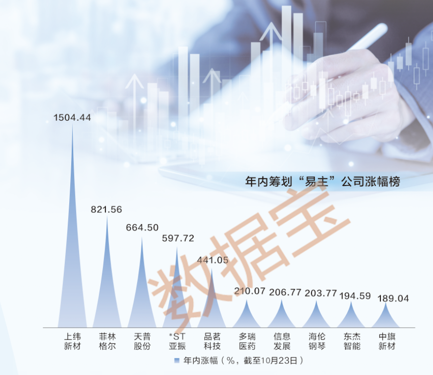 基于对资产运作的预期,上市公司控制权交易,往往伴随着股价大涨。据数据宝统计,截至10月23日,年内有筹划控制权交易的上市公司中,有22家年内股价已翻番。A股年内股价涨幅前十的公司中,有5家涉及控制权交易,包括上纬新材、菲林格尔)