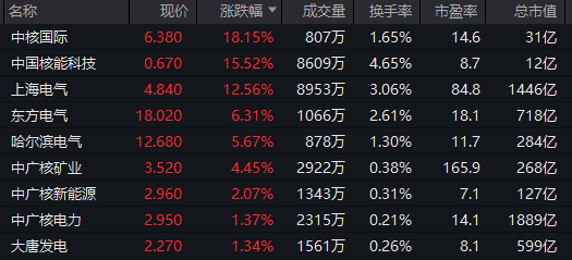 电力板块震荡拉升,中核国际涨超18%,中国核能科技、上海电气)