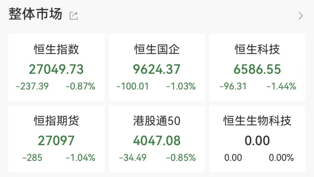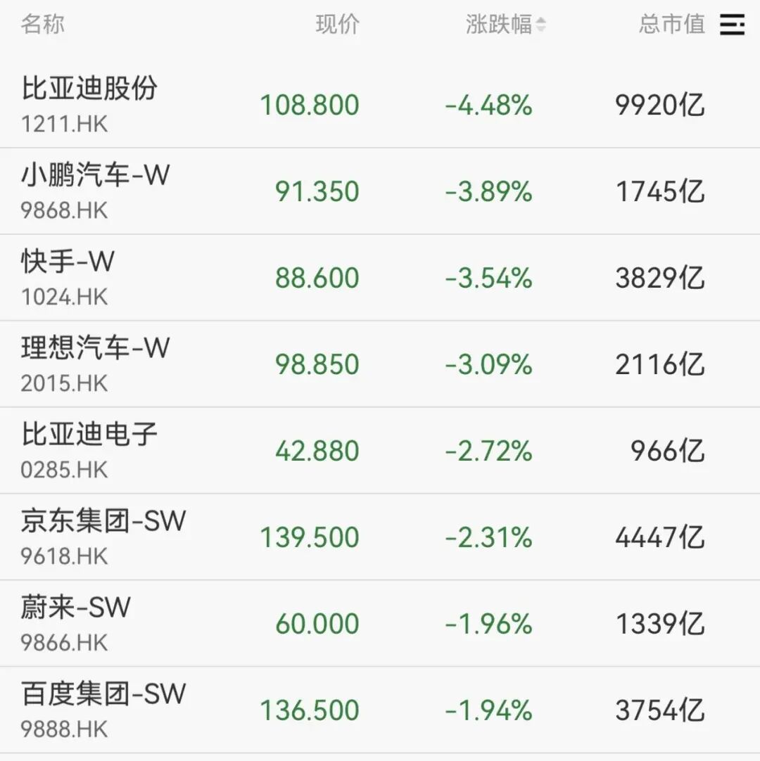 10月3日,港股市场震荡走低,恒生科技指数跌超1%,汽车股集体走低,比亚迪)