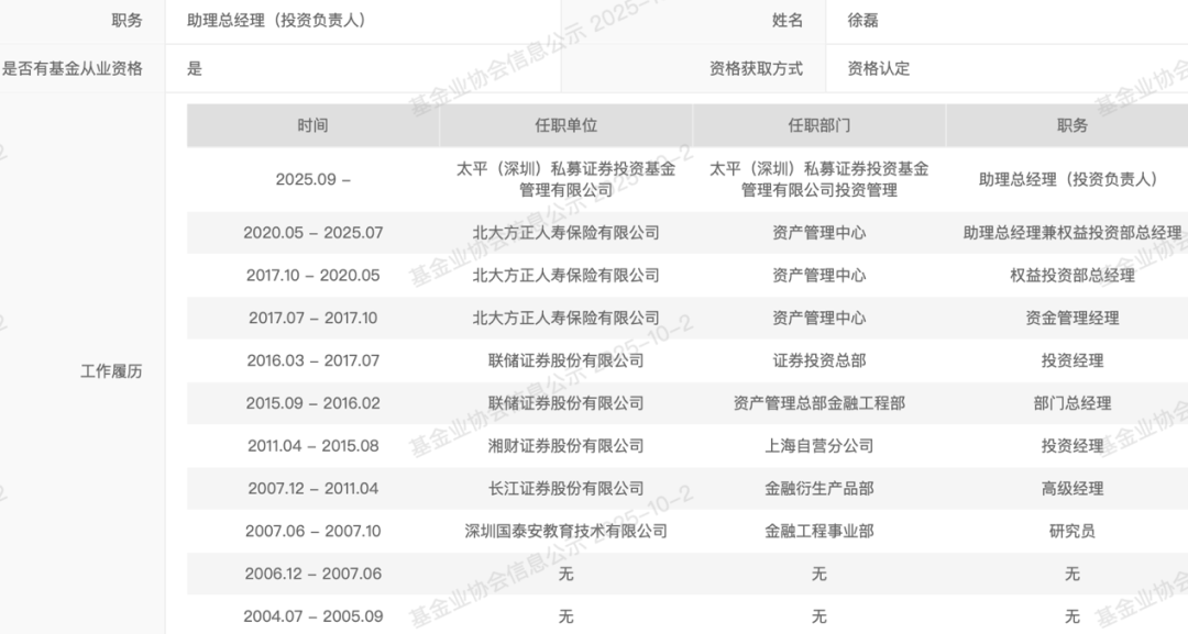 太平私募助理总经理、投资负责人徐磊,曾经在长江证券、湘财证券、联储证券担任投资经理,后加入北大方正人寿保险,担任资产管理中心助理总经理兼权益投资部总经理,2025年9月加入太平私募。