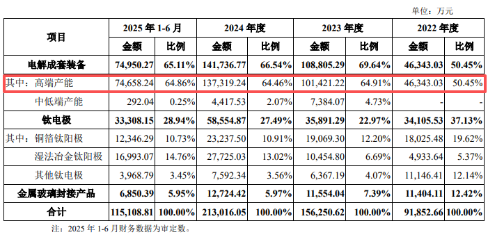 从收入构成来看,2022年至2024年以及2025年上半年(下称“报告期”),泰金新能主营业务涵盖电解成套装备、钛电极及金属玻璃封接产品。其中,电解成套装备产品收入增长突出,金额分别为4.63亿元、10.88亿元、14.17亿元和7.5亿元,占主营业务收入的比例分别为50.45%、69.64%、66.54%和65.11%。