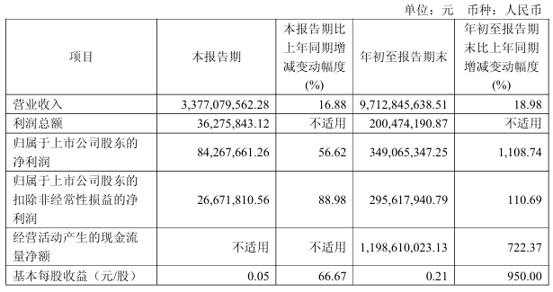 href=/600460/>士兰微(600460)(600460)三季报显示,公司第三季度营收为33.77亿元,同比增长16.88%;归属于上市公司股东的净利润为8426.77万元,同比增长56.62%。前三季度营收为97.13亿元,同比增长18.98%;归属于上市公司股东的净利润为3.49亿元,同比增长1108.74%。