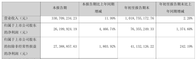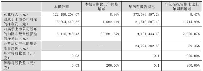 href=/002931/>锋龙股份(002931)(002931)三季报显示,公司第三季度营收为1.22亿元,同比增长8.99%;净利润为620.44万元,同比增长1082.14%。前三季度营收为3.73亿元,同比增长9.47%;净利润为2151.85万元,同比增长1714.99%。
