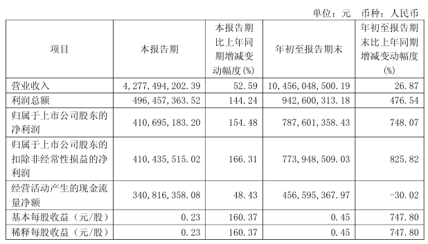 href=/600392/>盛和资源(600392)(600392)三季报显示,公司第三季度实现营收42.77亿元,同比增长52.59%;归属于上市公司股东的净利润为4.11亿元,同比增长154.48%。前三季度实现营收104.56亿元,同比增长26.87%;归属于上市公司股东的净利润为7.88亿元,同比增长748.07%。业绩大幅增长主要得益于市场行情向好,主要稀土产品价格较大幅度上升,公司紧抓市场机遇,优化生产与营销策略,提升销量,同时加强管理赋能和成本管控,销售毛利率及盈利能力显著提高。