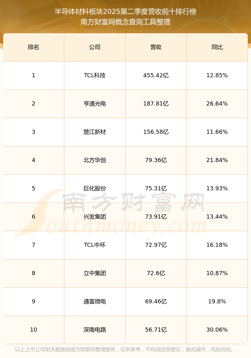 按照概念查询工具统计,该股所属板块为半导体材料板块,该板块共有204只股票,上海贝岭2025第二季度营收在该板块中排名为第204名,该板块2025第二季度营收排名前十的股票如下表: