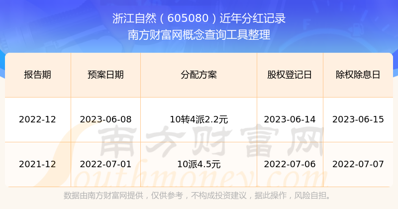 浙江自然最新一次公布的分红方案为10转4派2.2元。本次权益分派股权登记日为2023年6月14日,除权除息日为2023年6月15日,派息日为2023年6月15日。