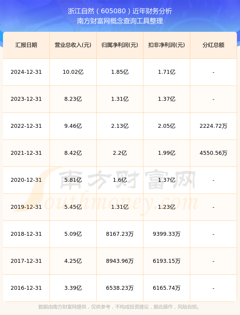 中华财富网(www.515558.com)2025-10-8 10:16:34讯: 浙江自然最新一次公布的分红方案为10转4派2.2元。本次权益分派股权登记日为2023年6月14日,除权除息日为2023年6月15日,派息日为2023年6月15日。 2024年总营收10.02亿,同比增长21.75%;净利润1.85亿,同比增长41.67%;销售毛利率33.72%。 近年浙江自然分红派息情况如下表所示: 浙江自然财务分析如下图: 浙江自然历年股息率走势如下图: 数据由整理提供,仅供参考,不构成投资建议,股市有风险,投资需谨慎,据此操作,风险自担。