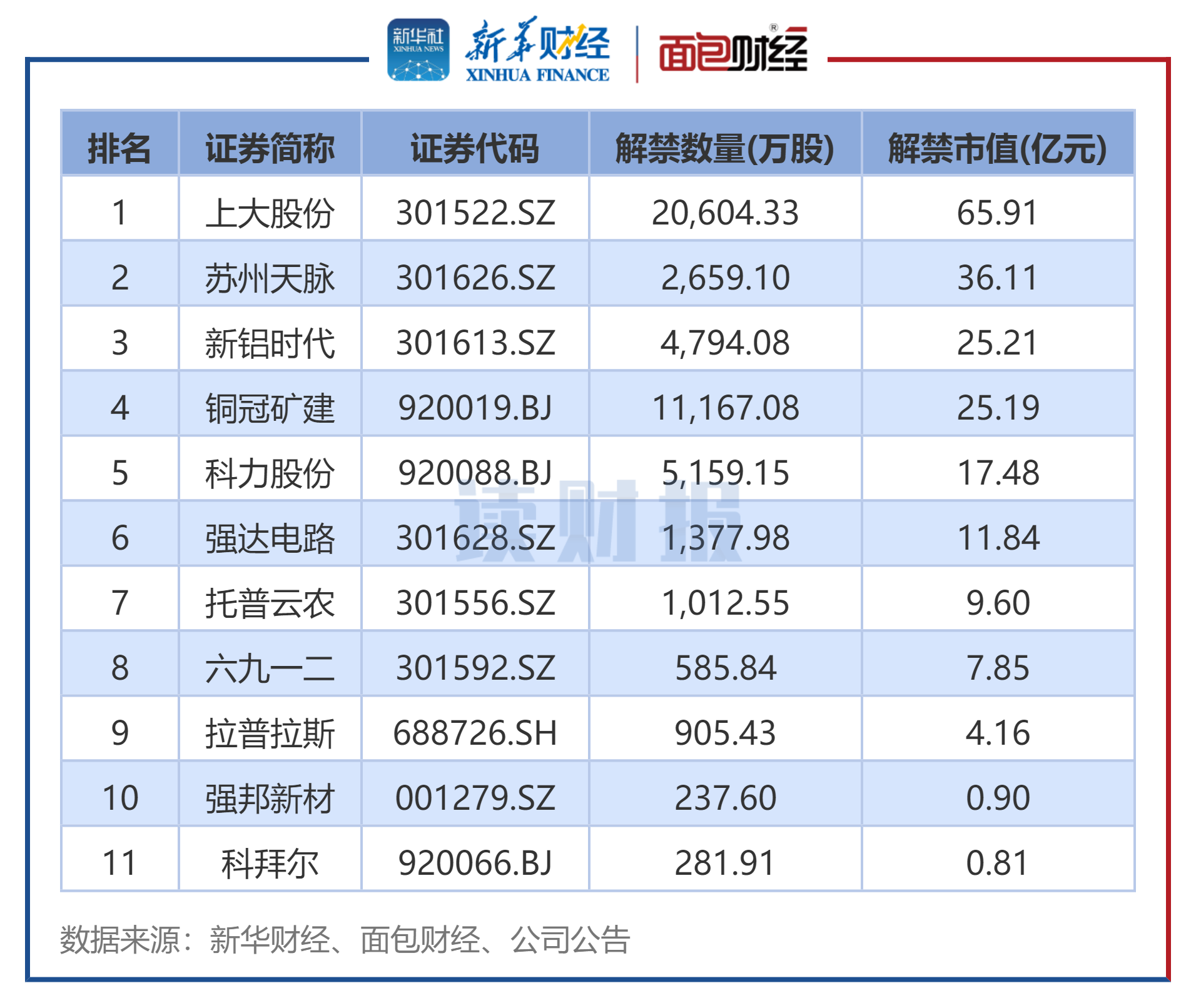 此外,共有11家公司、4.88亿限售股于10月迎上市周年解禁,解禁市值为205.07亿元,包括上大股份(301522)、苏州天脉(301626)、新铝时代(301613)等企业。