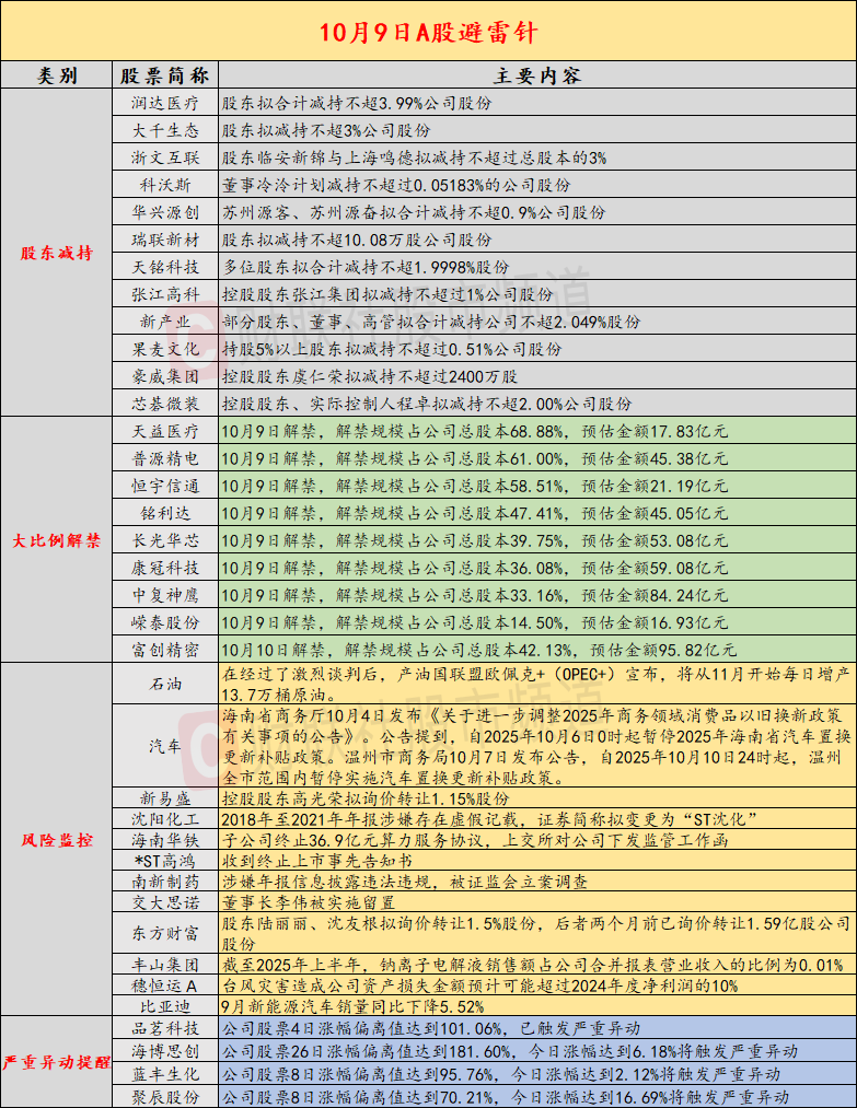 导读:财联社10月9日投资避雷针,近日,A股及海外市场潜在风险事件如下。国内经济信息方面包括:1)海南与温州暂停汽车置换更新补贴政策;2)乘联分会秘书长崔东树发文,汽车经销商已难以摆脱生存困境;公司方面重点关注包括:1)新易盛控股股东高光荣拟询价转让1.15%股份;2)海南华铁子公司终止36.9亿元算力服务协议,上交所对其下发监管工作函;海外市场重点关注包括:1)特朗普宣布对进口中型和重型卡车征收25%关税;2)OPEC+同意11月原油增产13.7万桶/日。