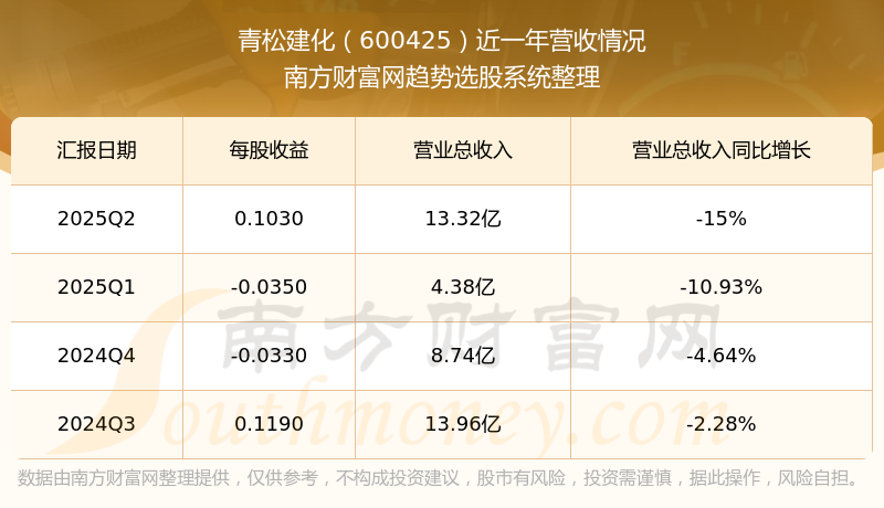 青松建化(600425)披露2025年第二季度报告,报告期实现营收13.32亿元,同比-15%;归母净利润1.65亿元,同比-27.87%;扣非净利润1.59亿元,同比-17.54%;基本每股收益0.1元。