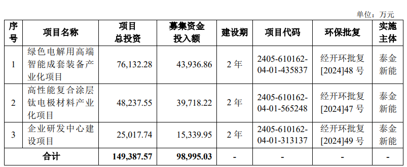 招股书显示,泰金新能主要从事高端绿色电解成套装备、钛电极以及金属玻璃封接制品的研发、设计、生产及销售,是国际上可提供高性能电子电路铜箔和极薄锂电铜箔生产线整体解决方案的龙头企业,是国内贵金属钛电极复合材料及电子封接玻璃材料的主要研发生产基地。