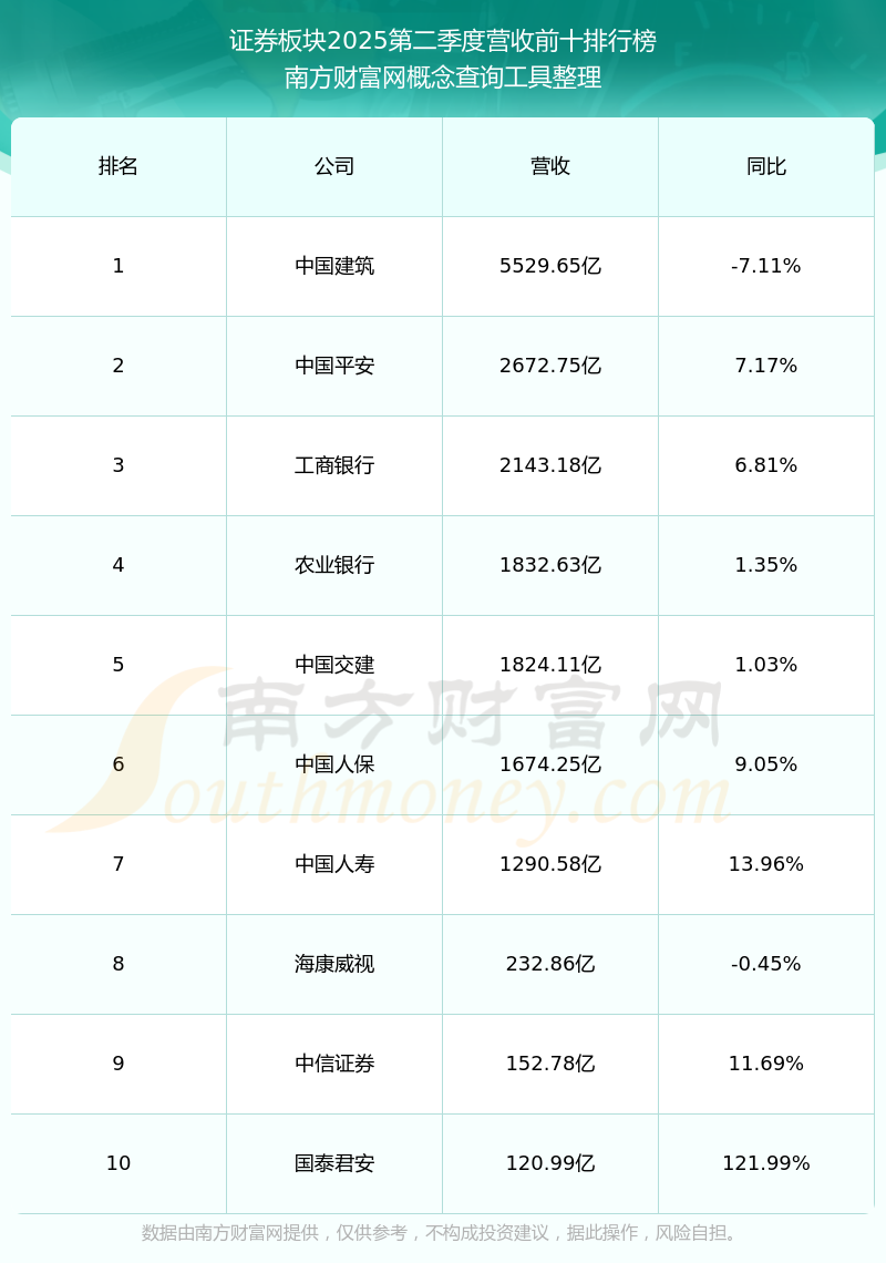 按照概念查询工具统计,该股所属板块为证券板块,该板块共有65只股票,华鑫股份2025第二季度营收在该板块中排名为第54名,该板块2025第二季度营收排名前十的股票如下表: