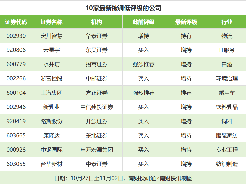 评级调低方面,10月27日至11月2日,券商调低上市公司评级达到40家次,最新数据包括了华泰证券对宏川智慧)