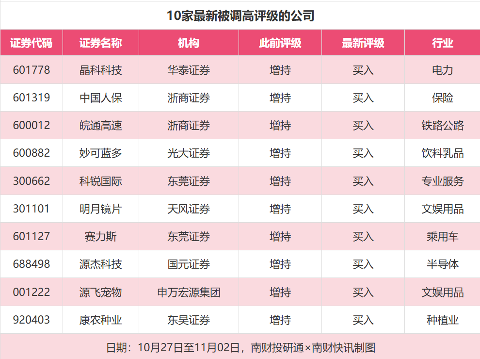 评级调高方面,10月27日至11月2日,券商调高上市公司评级达到24家次,最新数据包括了华泰证券对晶科科技)