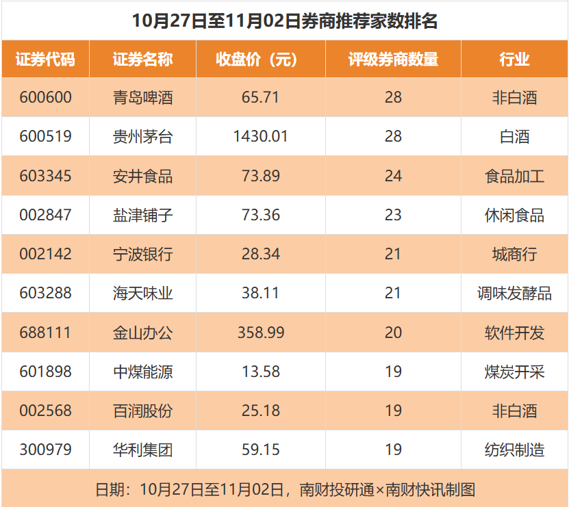 从券商推荐家数来看,10月27日至11月2日有1609家上市公司得到券商推荐,其中青岛啤酒)