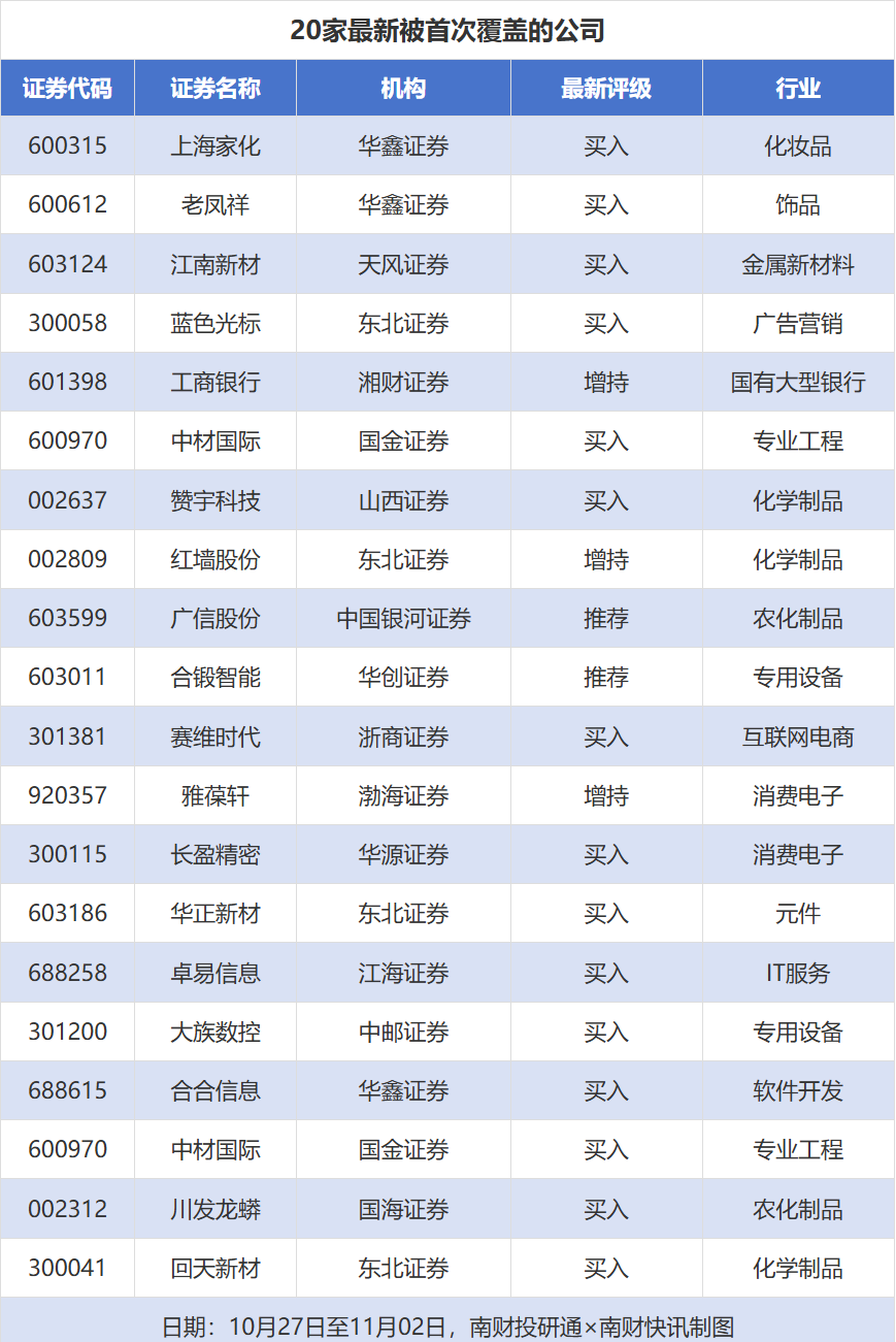 首次覆盖方面,10月27日至11月2日券商共给出了98次首次覆盖,其中上海家化)