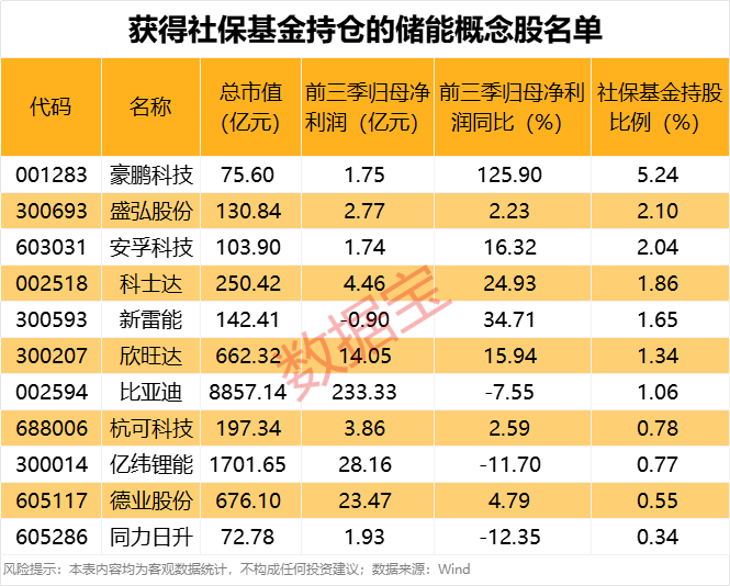 截至三季度末,11只储能概念股获得社保基金持仓,豪鹏科技、盛弘股份)