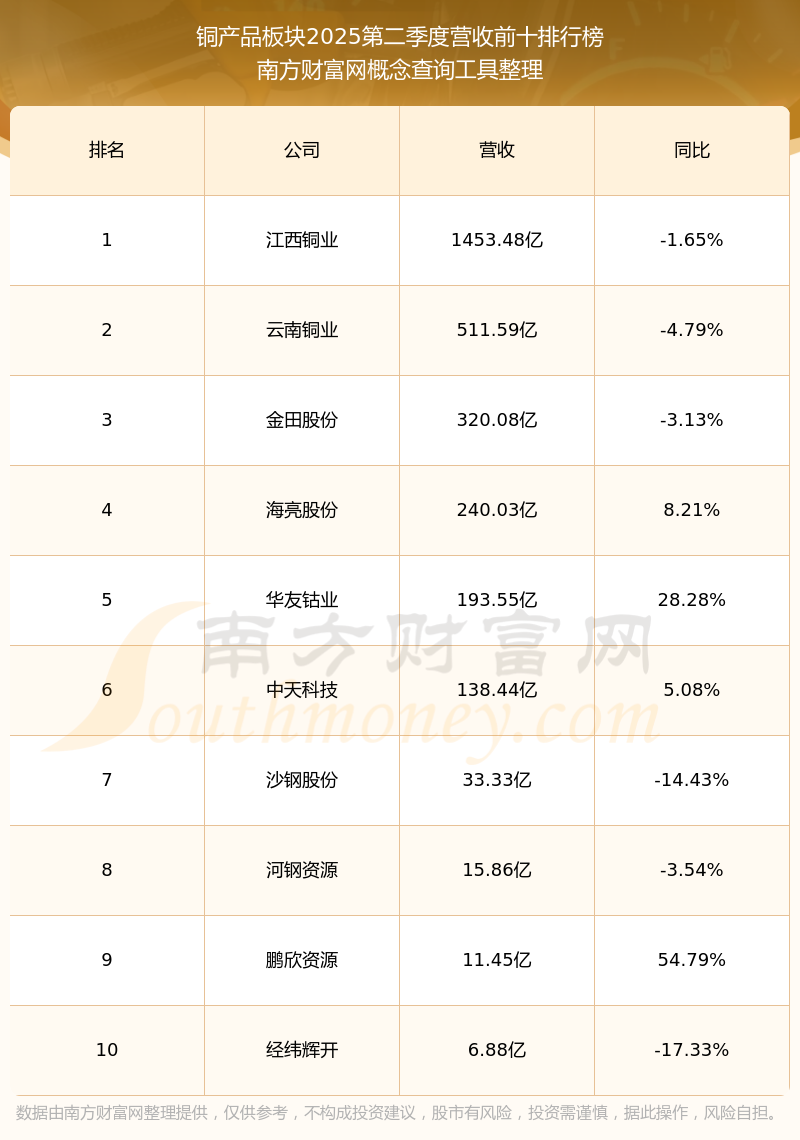 按照概念查询工具统计,该股所属板块为铜产品板块,该板块共有11只股票,豫光金铅2025第二季度营收在该板块中排名为第11名,该板块2025第二季度营收排名前十的股票如下表: