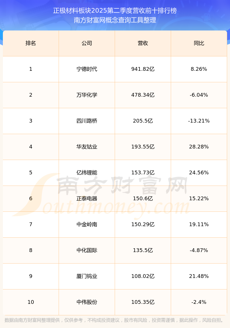 按照概念查询工具统计,该股所属板块为正极材料板块,该板块共有95只股票,华友钴业2025第二季度营收在该板块中排名为第4名,该板块2025第二季度营收排名前十的股票如下表: