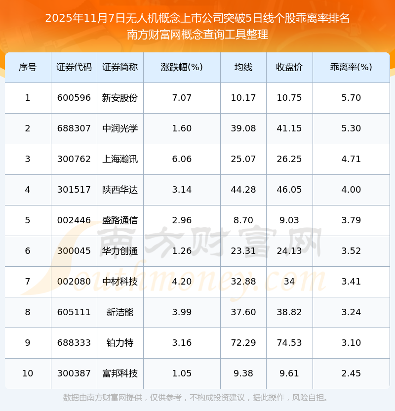 2025年11月7日无人机概念上市公司突破5日线个股乖离率排名