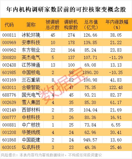 相关概念股也受到投资者关注。据证券时报·数据宝统计,今年以来,近50余只可控核聚变概念股中,几乎所有个股都接受了投资者调研。从调研次数看,冰轮环境)