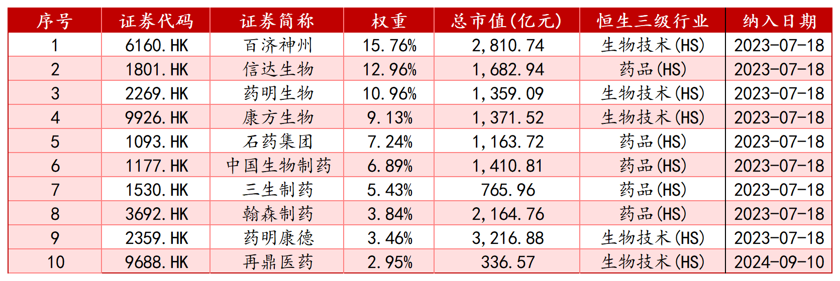 恒生港股通创新药精选指数前十大持仓 数据来源:同花顺)